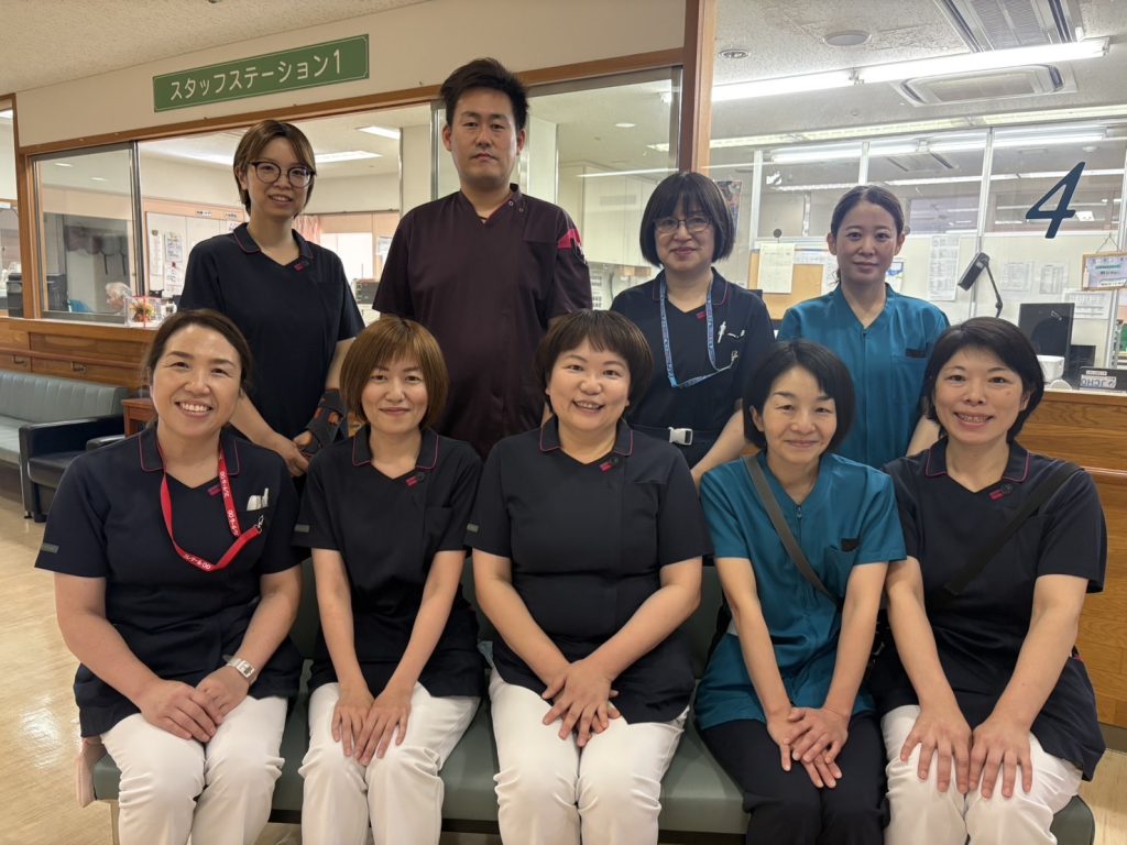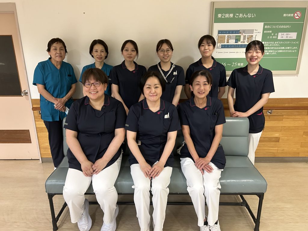 東2病棟は整形外科と内科の混合病棟で、幅広い疾患に対応した一般病棟です。骨折や関節疾患などの整形外科手術を受ける患者さんに加え、慢性疾患や感染症など内科的な治療を必要とする患者さんも多く受け入れています。また、急性期病棟として地域の方々の救急搬送の受け入れも行っており、日々様々な症例に対応しています。そのため、幅広い知識と技術が求められ、看護師として成長できる環境が整っています。若手からベテランまで幅広い年代のスタッフが在籍し、明るく活気のある雰囲気で協力しながら質の高い看護を目指しています。さらに退院支援に力を入れており、患者さんが自宅や新しい生活の場所で安心して生活できるよう、早期から在宅支援に向けた支援を行っています。