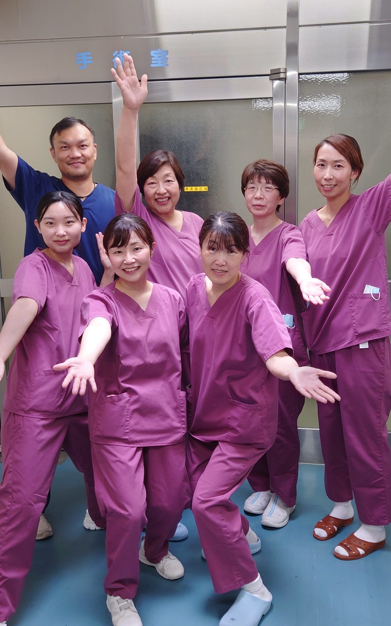 手術室では、整形外科と眼科の手術を行っています。整形外科は脊椎手術、膝・股関節の人工関節手術、骨折に対する骨接合術、関節鏡手術など幅広い手術を行っています。眼科は、主に白内障手術を行っています。中央材料室は、院内で使用する器械・衛生材料の洗浄・滅菌、物品の定数管理SPD業務を行っています。手術室看護師は患者さんの安全を第一に考え、術前訪問で手術や麻酔について説明を行い、安心して手術を受けていただけるように努めています。術後訪問で看護の評価を行い、より良い看護の提供を目指しています。