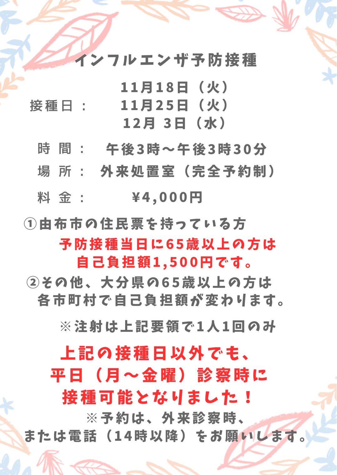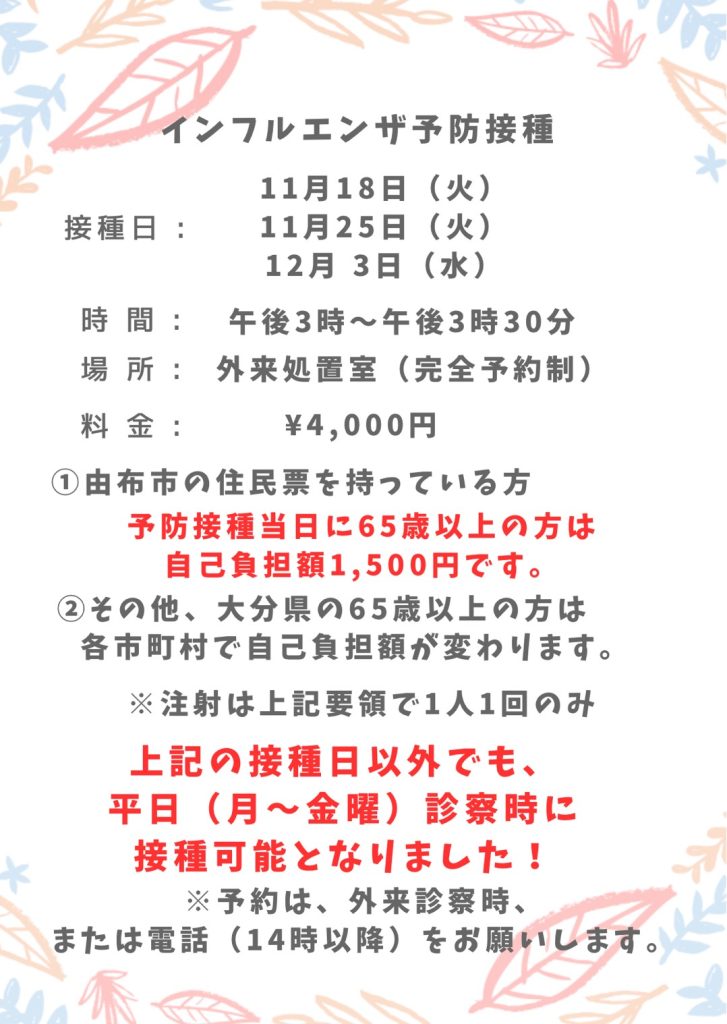 以前よりお知らせしていた接種日以外でも、平日診察時にインフルエンザの予防接種が可能となりました。詳細は下記の画像をご覧ください。